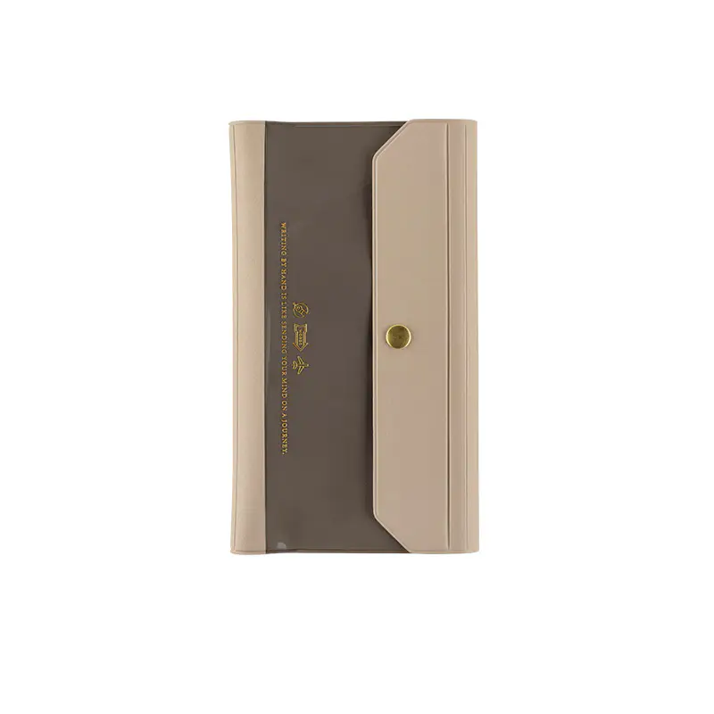 This slim PVC cover has a clear pocket as its main feature. The cover name “Alettone” refers to the part of an aircraft’s wings called an aileron, due to the way the techo cover’s lid can similarly fold shut with a snap. The soft PVC material makes it light and comfortable to carry, while the subdued color scheme gives it a sense of elegance. It closes with a snap button and has a design that fits any user in any setting. Foil-pressed in gold is the thought-provoking message, “Writing by hand is like sending your mind on a journey.”