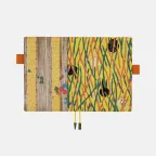 The back pocket features a cut with a design in a subtly different shade of yellow. Vertical stripes reminiscent of wood grain intertwine with Kasuri splashed patterns, while leaves and petals seem to dance and flutter across the surface. This delightful pairing, where classical motifs blend seamlessly with imaginative design, captures the distinctive charm that makes Bijutsukai so wonderfully unique.