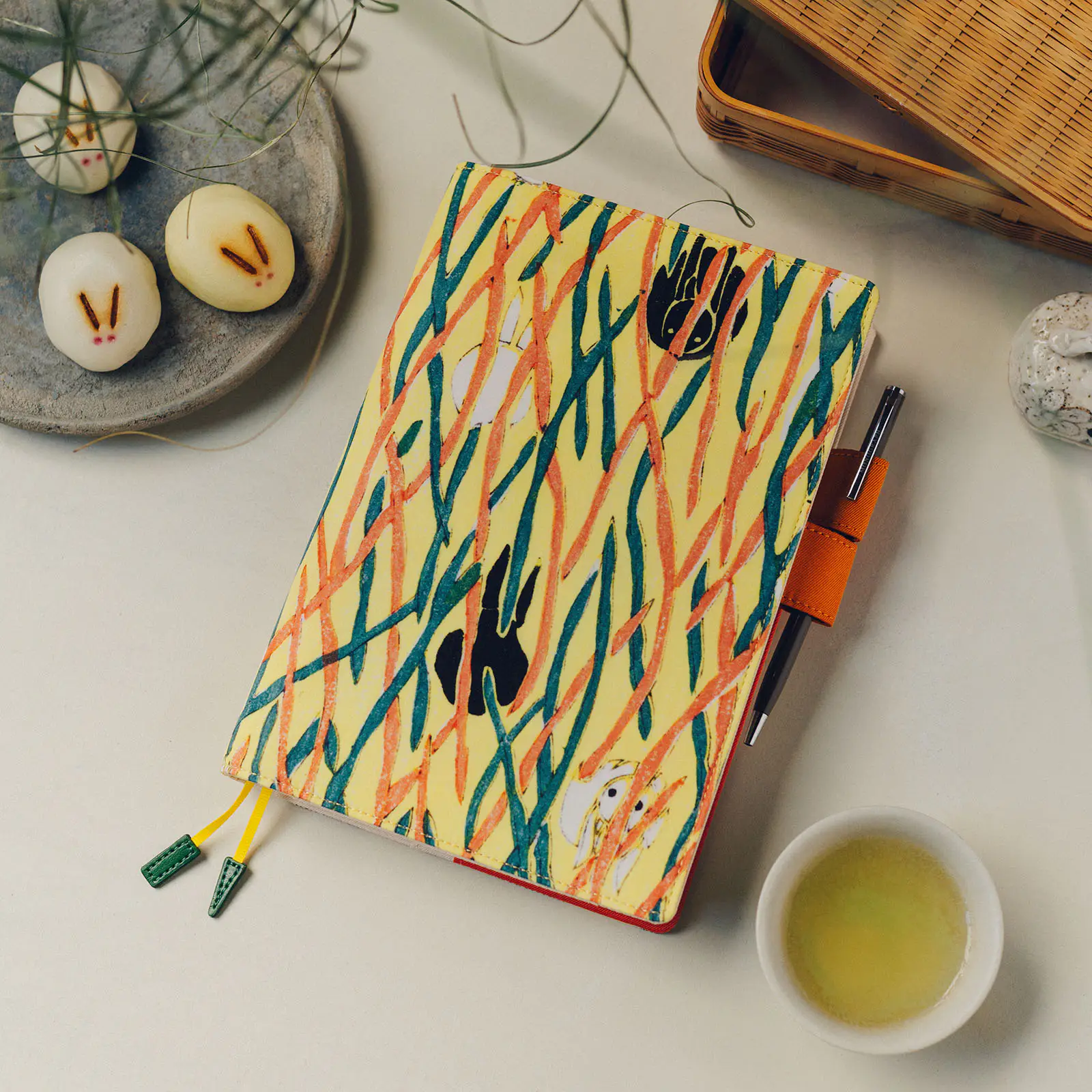 The “butterfly-stopper” pen holders and bookmark charms are colored to echo the plants and flowers featured in each design. The inner cover is a calming, soft beige.