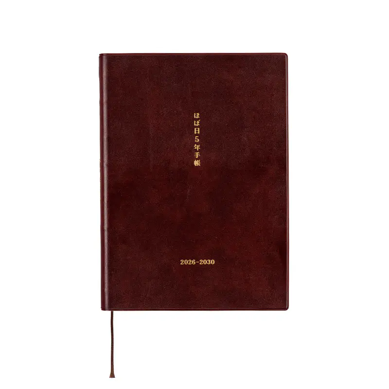 This A5-size book has pages dated across a 5-year span. The textured cover is a calming shade of brown with the years foil-pressed in gold, and the book contains a dark brown bookmark for a complete look that works well without adding an additional cover.