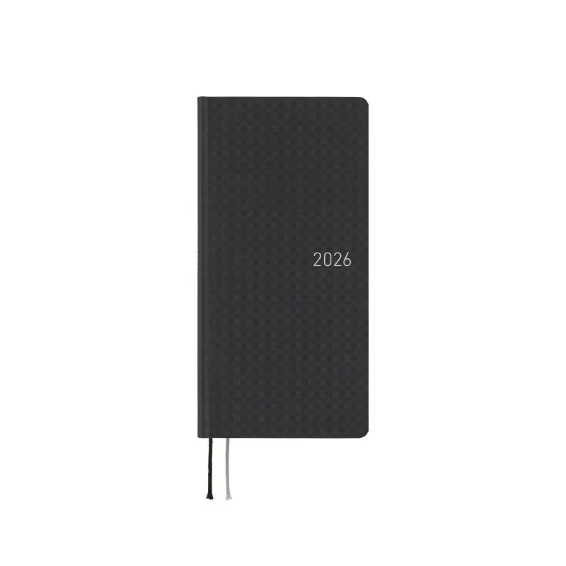 This book may seem like an ordinary black techo, but when you look closely, you will find the entire surface covered with a plaid pattern. The book is made of Takeo’s “Gingham GA,” a paper embossed with plaids reminiscent of gingham. You can see the gingham pattern from different angles of light. Although it’s embossed, it feels smooth to the touch. The year 2026 is foil-pressed in silver.