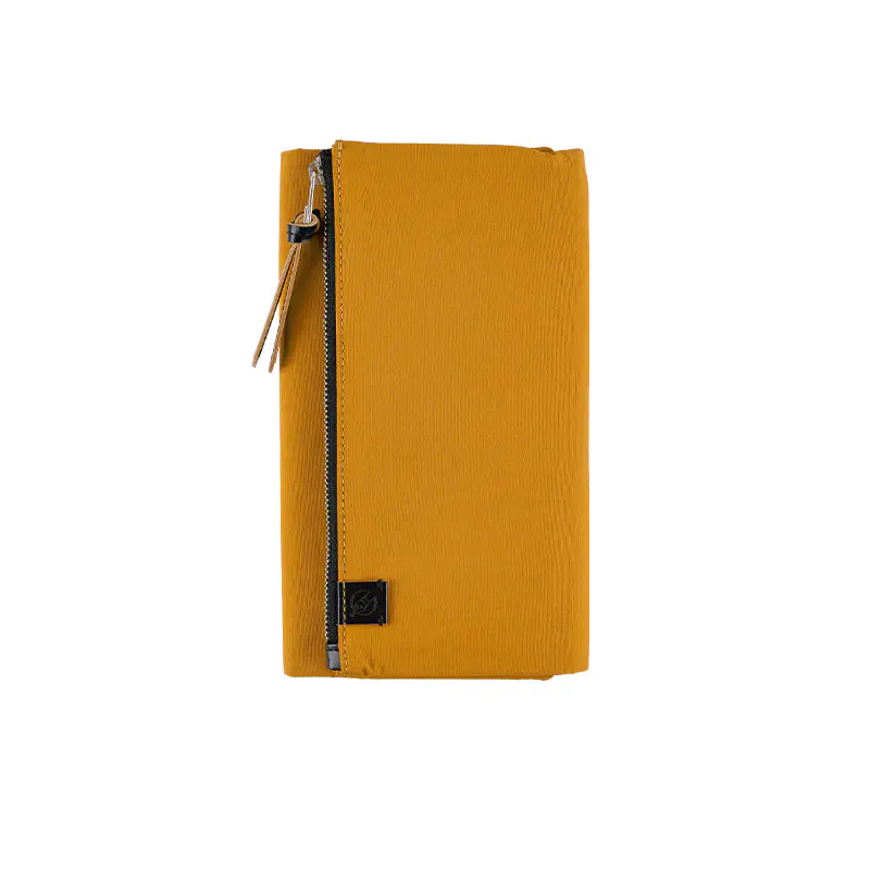 Its standout feature is the generously sized pocket, but its overall appearance remains clean and minimal. With its calming and gentle oakmoss color, the design is versatile and suits anyone. Though it folds into thirds and fastens with a magnetic closure, the cover is light in hand. The aim was effortless elegance, something that looks sharp without being flashy. The material is a soft nylon with a sophisticated sheen.