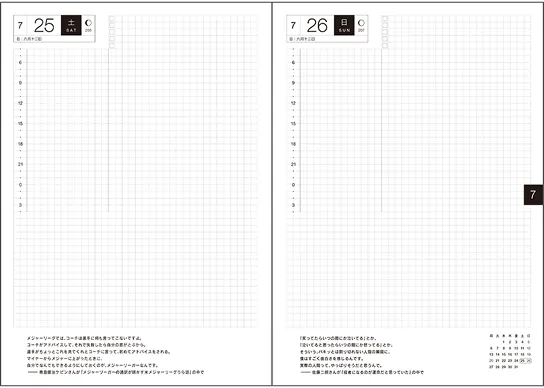 Listed InformationDay of the year / Week of the year (listed on monthly calendars and weekly pages) / Old lunar calendar / Rokuyo (traditional Japanese lunisolar calendar) (listed on monthly calendars) / Solar terms / Japanese holidays / Moon phase (daily pages include every phase, monthly calendars and weekly pages only include full and new moon)