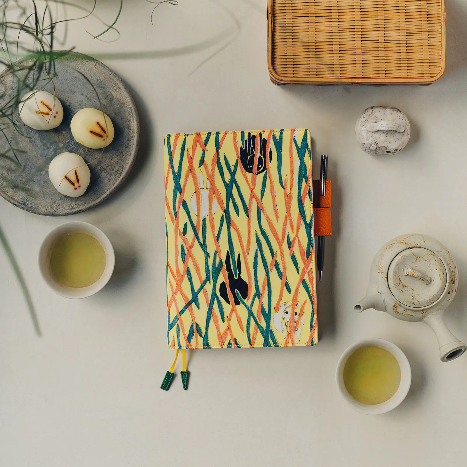 The “butterfly-stopper” pen holders and bookmark charms are colored to echo the plants and flowers featured in each design. The inner cover is a calming, soft beige.