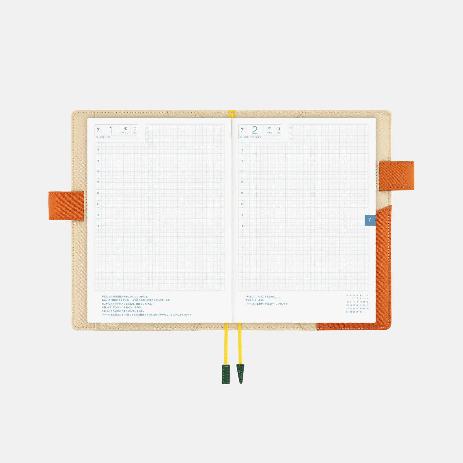 | Daily Pages | Book 1: Jan. 1 - Jun. 30, 2026 (187 pages) Book 2: Jul. 1 - Dec. 31, 2026 (190 pages) *A page is included at the beginning of each month to help in planning ahead. *All daily pages include daily quotes. *Includes a mini monthly calendar at the bottom right of every two-page spread (Monday-start). *Additionally, a blank two-page spread (three pages for Book 2) is featured at the beginning to provide a free area when starting out the book. |