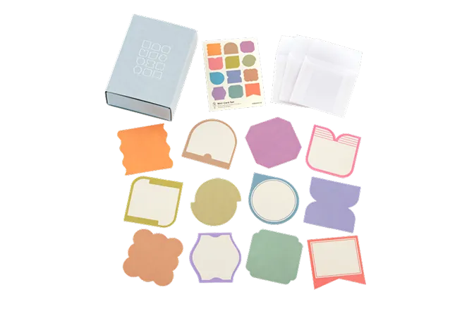 This set includes 12 unique card shapes, with two of each design. It also comes with a sheet of matching sealing stickers and six translucent envelopes, all packaged in a sleeve-style box.