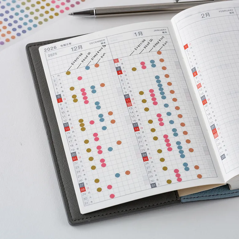 The Transparent Dot Stickers are made of sturdy, transparent PET material and come in round shapes that fit neatly within the grid of the Hobonichi Techo. Available in three different sizes.