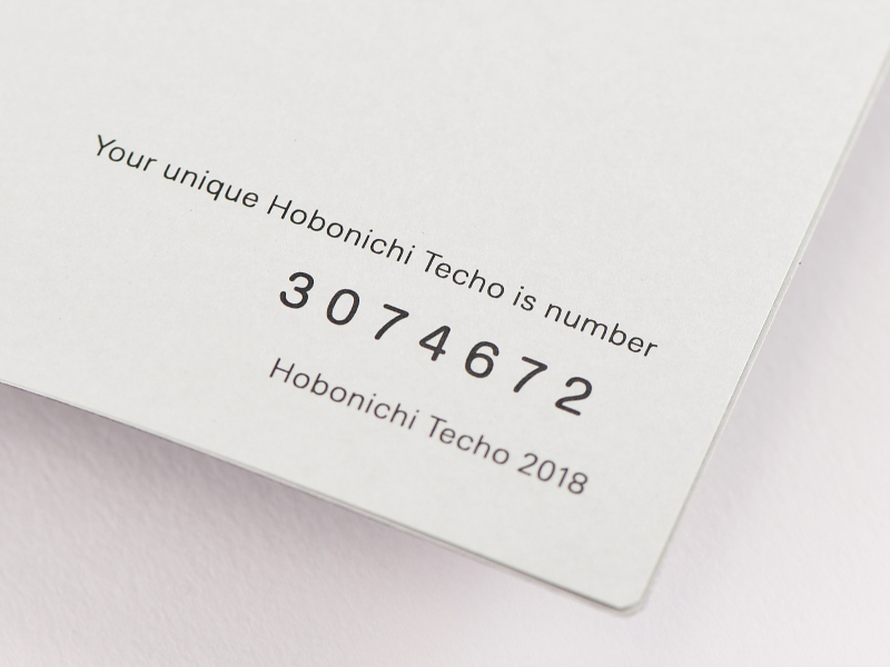 手帳本体の見返しには、1冊ずつすべて異なる製造ナンバーが印字されています。(2018年版のものは、それまでとすこしデザインが変わりました)
