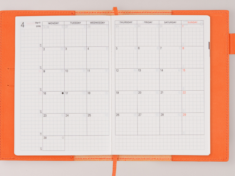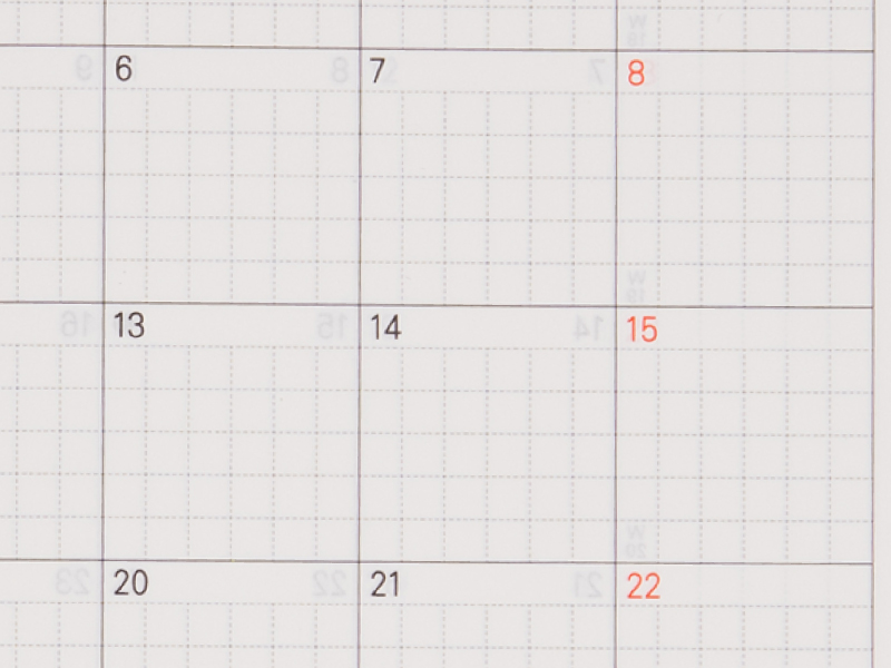 スケジュール管理に便利な月間カレンダーです。ページ全体に方眼がうすく印刷されていることで、予定やメモをきれいに書きやすくなっています。チャコールグレーと明るいレッドの、すっきりとしたデザインです。