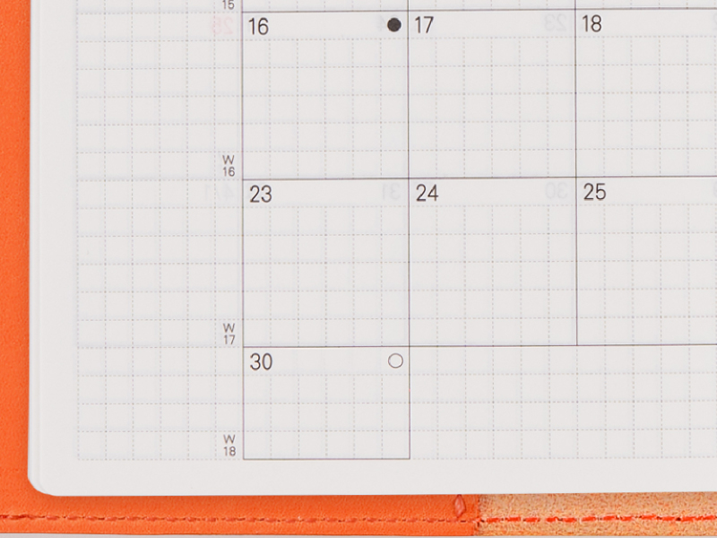1日ごとに予定などを自由に書きこむことができます。方眼がうすく印刷されているため小さな文字も書きやすく、ボックス内を区切って使いたいときにも便利です。