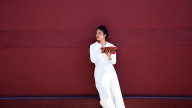 (問い合わせ先) - コットンのテイルカーディガン¥45,000、ヘンリーネックスウェットシャツ¥30,000、エプロン¥23,000、シルクのサテンパンツ¥40,000(以上humoresque:03-6427-2353)