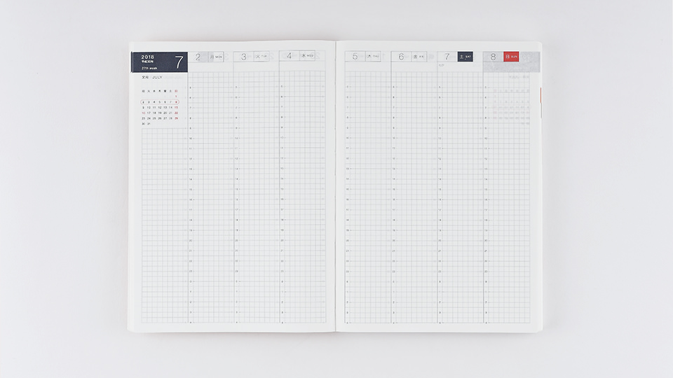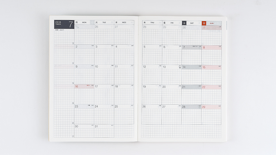 - 日番号/週番号(月間カレンダーに記載)/旧暦/六曜(大安、仏滅など)(月間カレンダーに記載)/二十四節気(立春、春分、夏至など)、雑節/祝日、記念日など(バレンタインデー、ひなまつり、母の日、父の日など)/月の満ち欠け(1日ページ全ページに記載、月間カレンダーに満月と新月のみ記載)