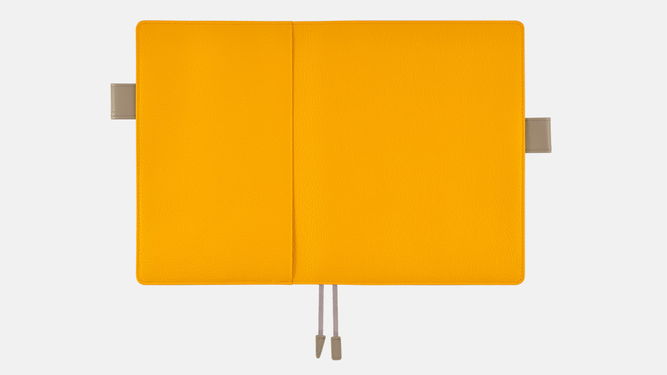 あざやかなイエローの革カバーです。