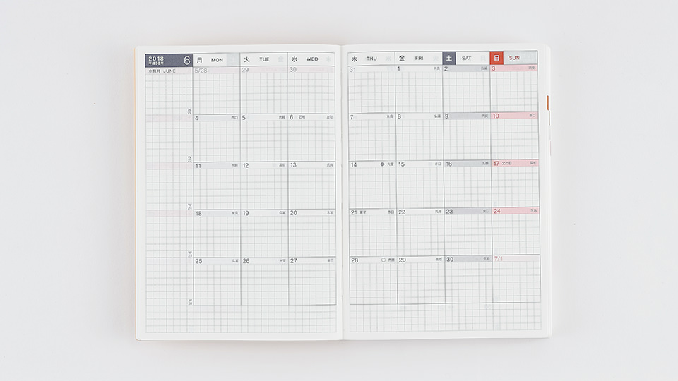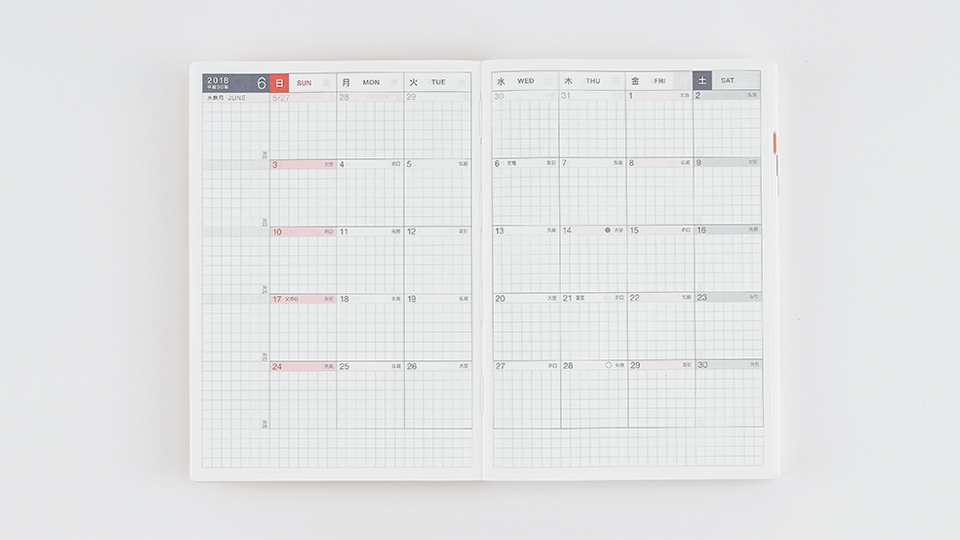 - 日番号/週番号(月間カレンダーに記載)/旧暦/六曜(大安、仏滅など)(月間カレンダーに記載)/二十四節気(立春、春分、夏至など)、雑節/祝日、記念日など(バレンタインデー、ひなまつり、母の日、父の日など)/月の満ち欠け(1日ページ全ページに記載、月間カレンダーに満月と新月のみ記載)