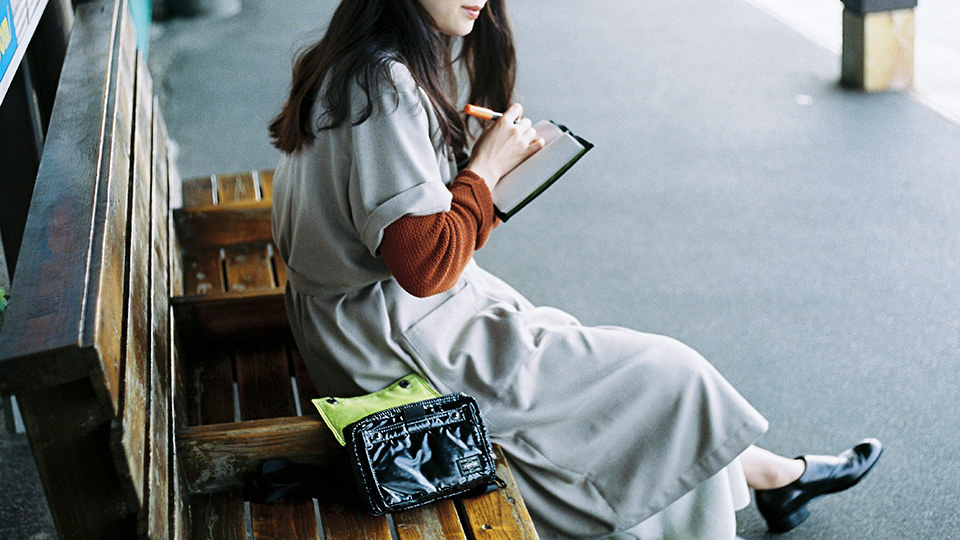 ペンホルダーを兼ねたタブで開くフロントのポケットは、