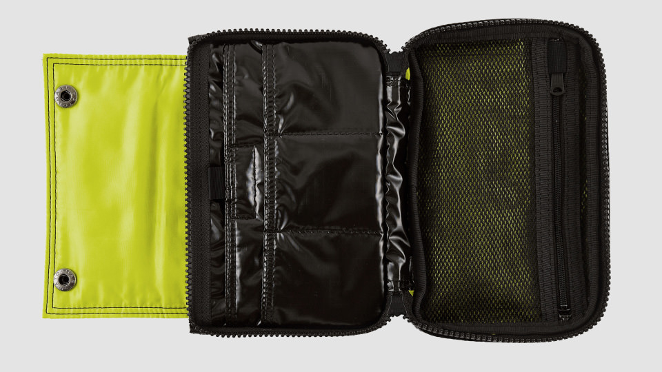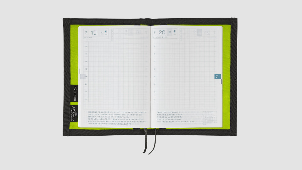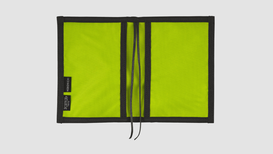 表側のフラップを開くと、内側は鮮やかなライムグリーン。