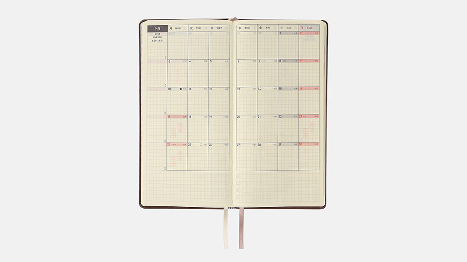- 週番号/六曜(大安、仏滅など)/二十四節気(立春、春分、夏至など)/祝日、記念日など(バレンタインデー、ひなまつり、母の日、父の日など)/月の満ち欠け(週間ページ全てに記載・月間カレンダーに満月と新月のみ記載)