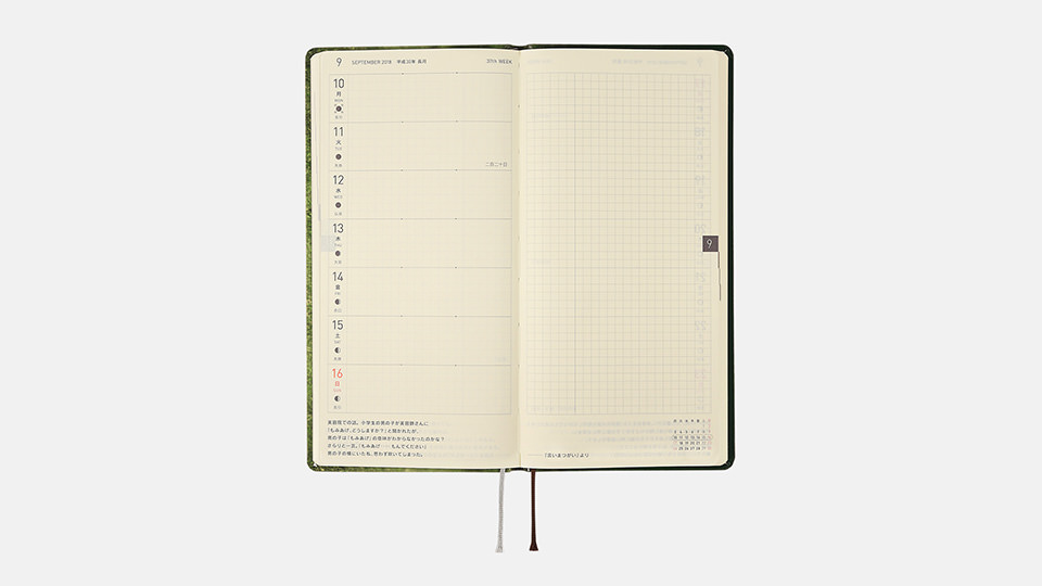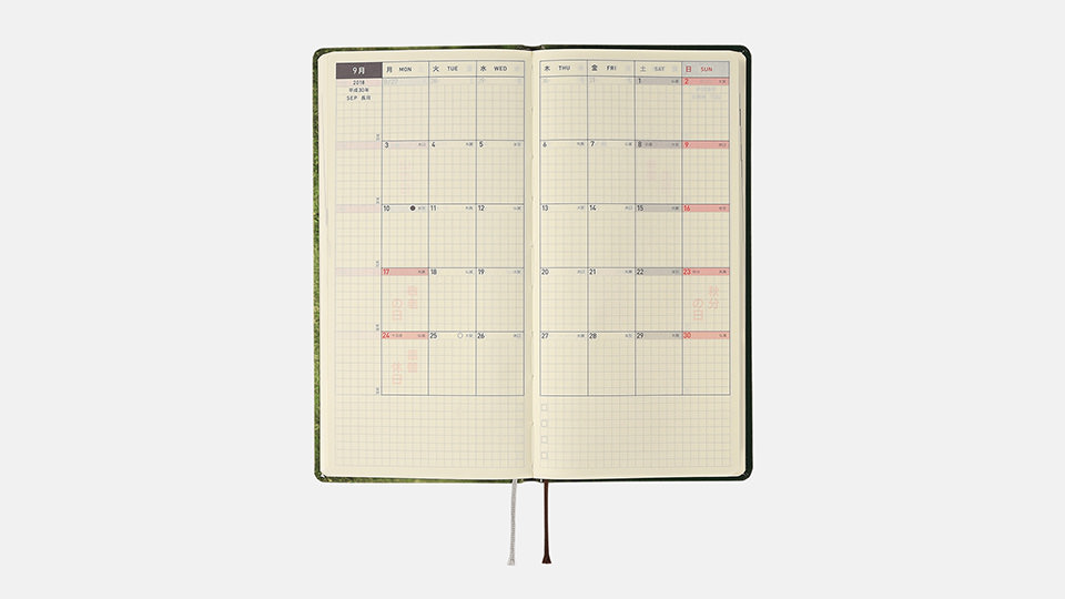 - 週番号/六曜(大安、仏滅など)/二十四節気(立春、春分、夏至など)/祝日、記念日など(バレンタインデー、ひなまつり、母の日、父の日など)/月の満ち欠け(週間ページ全てに記載・月間カレンダーに満月と新月のみ記載)