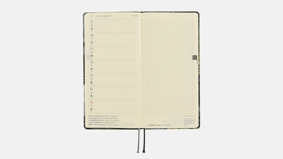 - 週番号/六曜(大安、仏滅など)/二十四節気(立春、春分、夏至など)/祝日、記念日など(バレンタインデー、ひなまつり、母の日、父の日など)/月の満ち欠け(週間ページ全てに記載・月間カレンダーに満月と新月のみ記載)