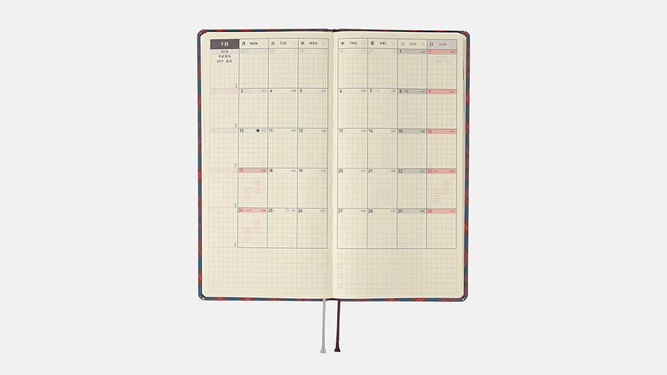 - 週番号/六曜(大安、仏滅など)/二十四節気(立春、春分、夏至など)/祝日、記念日など(バレンタインデー、ひなまつり、母の日、父の日など)/月の満ち欠け(週間ページ全てに記載・月間カレンダーに満月と新月のみ記載)