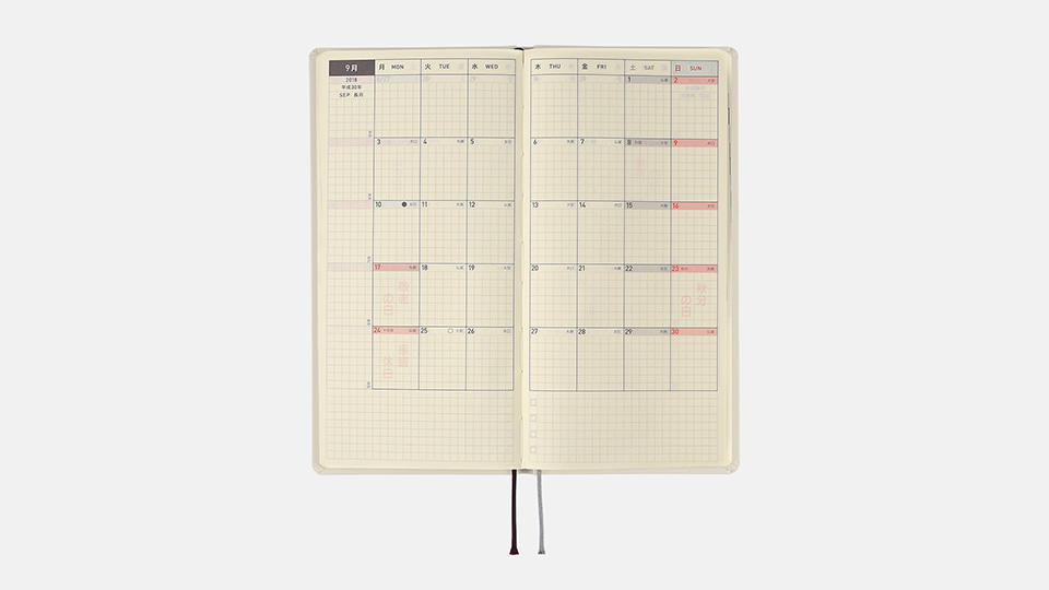 - 週番号/六曜(大安、仏滅など)/二十四節気(立春、春分、夏至など)/祝日、記念日など(バレンタインデー、ひなまつり、母の日、父の日など)/月の満ち欠け(週間ページ全てに記載・月間カレンダーに満月と新月のみ記載)