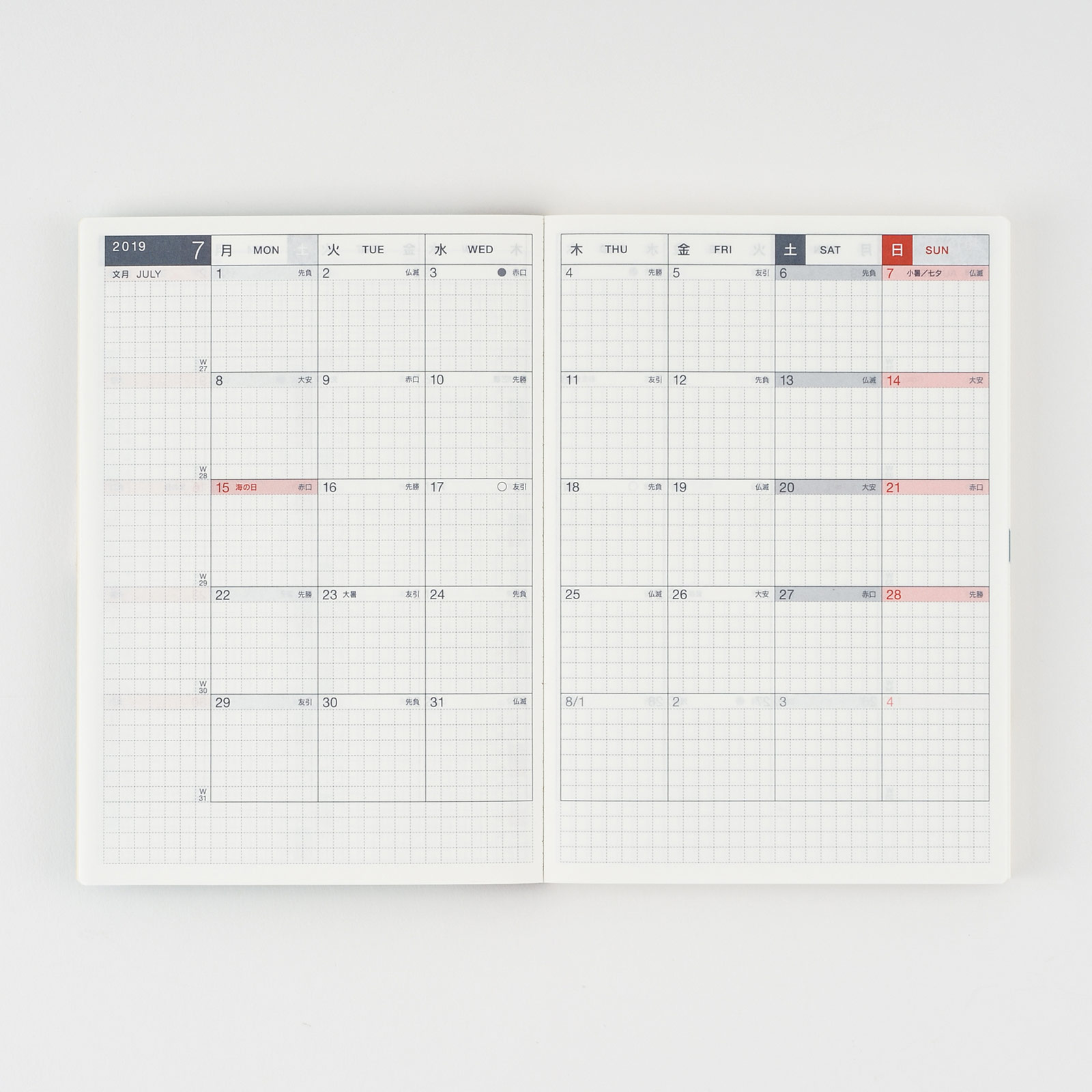| 記載される内容 | 日番号/週番号(月間カレンダーに記載)/旧暦/六曜(大安、仏滅など)(月間カレンダーに記載)/二十四節気(立春、春分、夏至など)、雑節/祝日、記念日など(バレンタインデー、ひなまつり、母の日、父の日など)/月の満ち欠け(1日ページ全ページに記載、月間カレンダーに満月と新月のみ記載) |