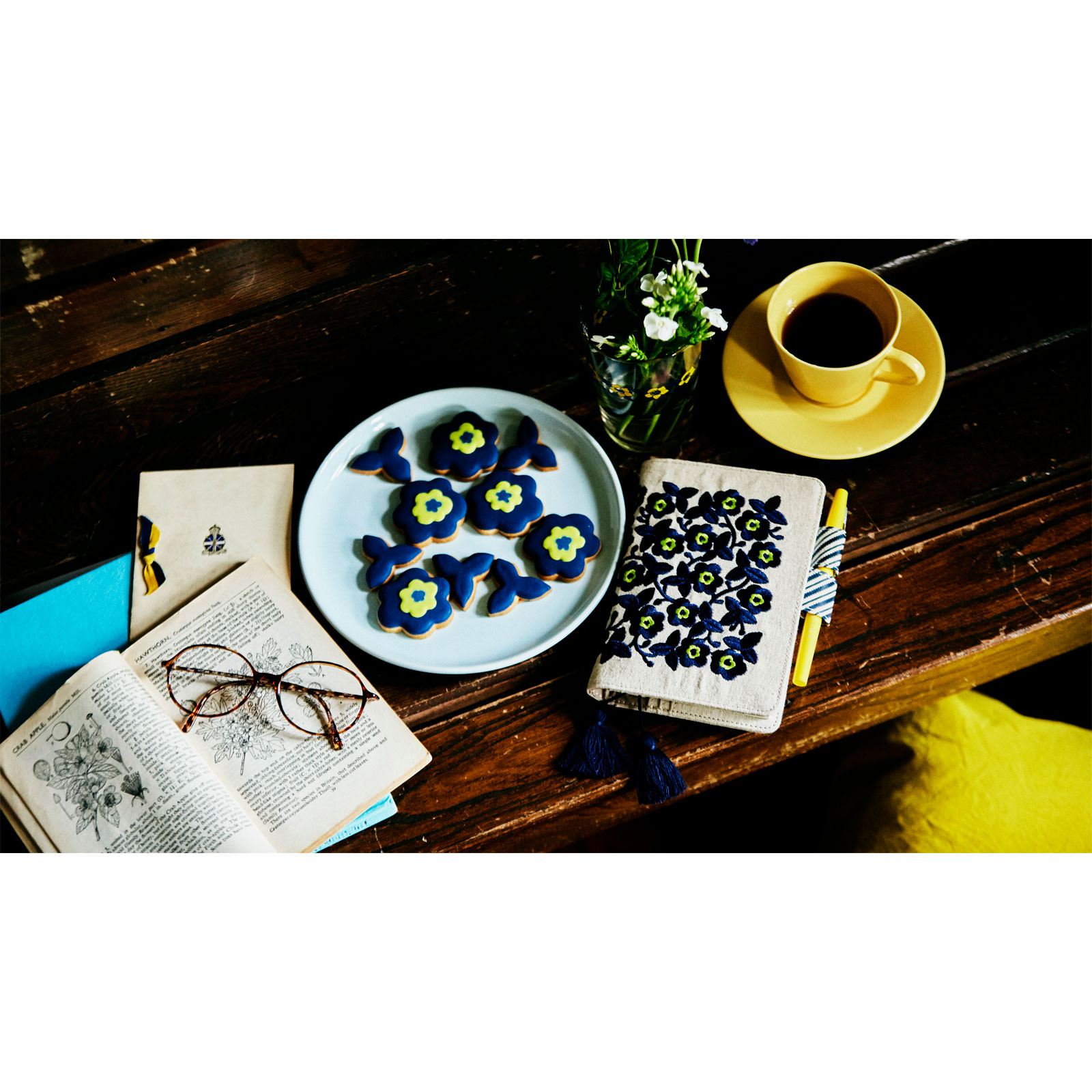 ネイビーの花に、蛍光の黄色がアクセント。