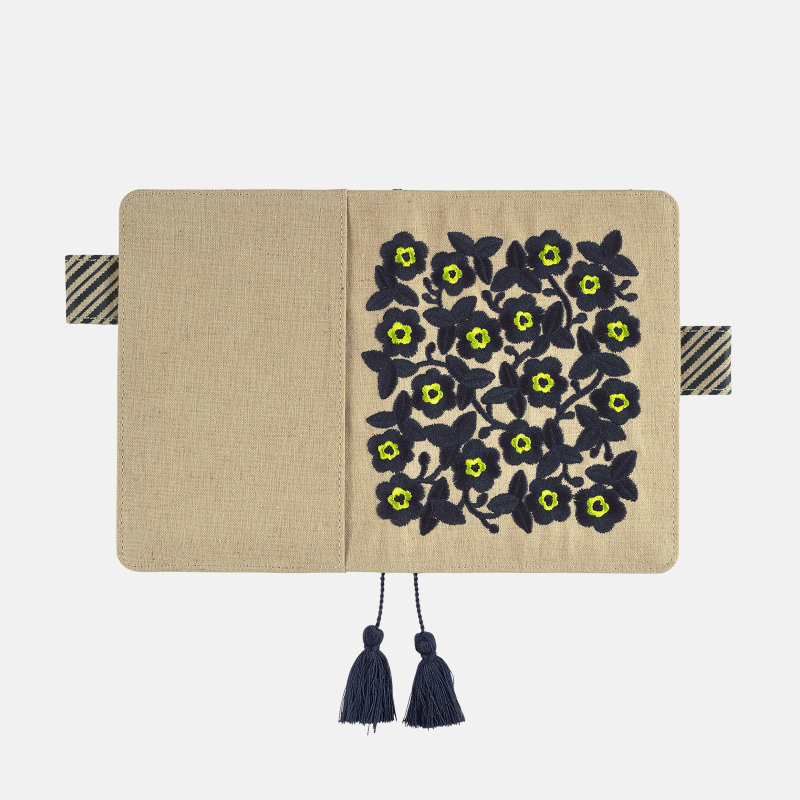 ネイビーの糸でつくられたしおりの先には