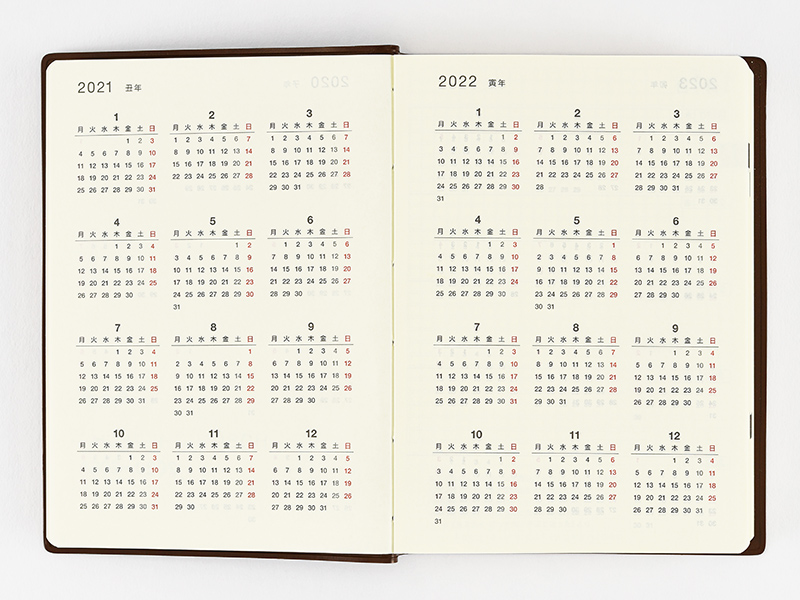 内表紙をめくると次のページからは、1年1ページで、5年分の年間カレンダーを掲載しています。西暦の横には十二支を記載しています。