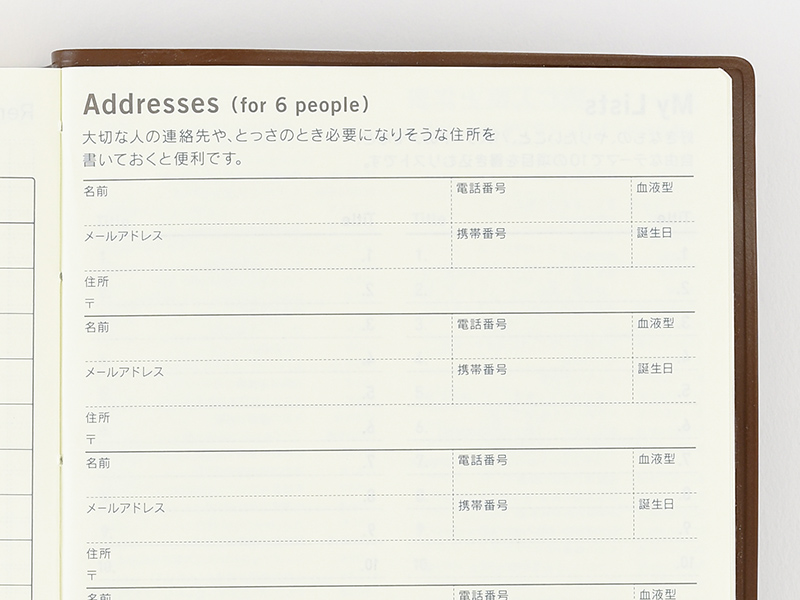家族や友人の連絡先などの情報を書いておけるアドレス帳です。オリジナルは6件分、カズンでは16件分、書き込むことができます。