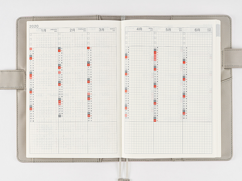 6ヵ月を見開きで一覧できる長期的な予定管理のページを12カ月分収録。ページの上部には、目標や、やるべきことを書いておけるチェックボックスが3つあります。下部には、自由に書き込めるスペースを設けています。<「年間インデックス」掲載期間>1月はじまり版:2020年1月~12月4月はじまり版:2020年4月~2021年3月