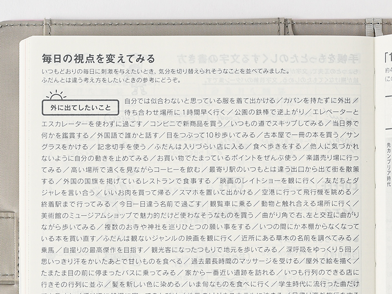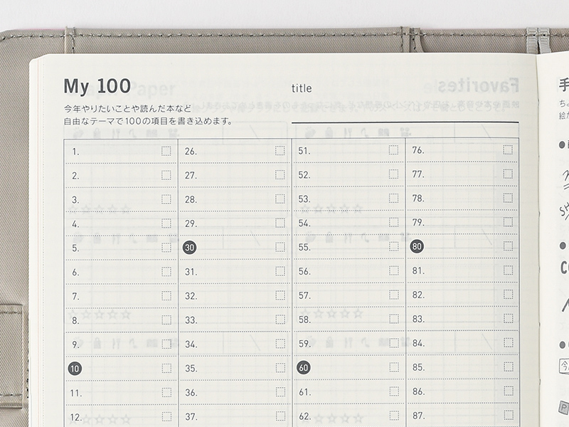 2018年版で非常に人気の高かったおまけページを復活させました。1年でやりたいことや読んだ本、見た映画など、自由なテーマで100の項目を書き込めます。