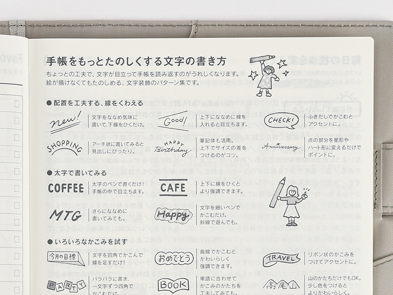 手書きの文字に表情をつけて目立たせる、さまざまな文字装飾のパターンを紹介しています。読み返したときのうれしさが増えます。
