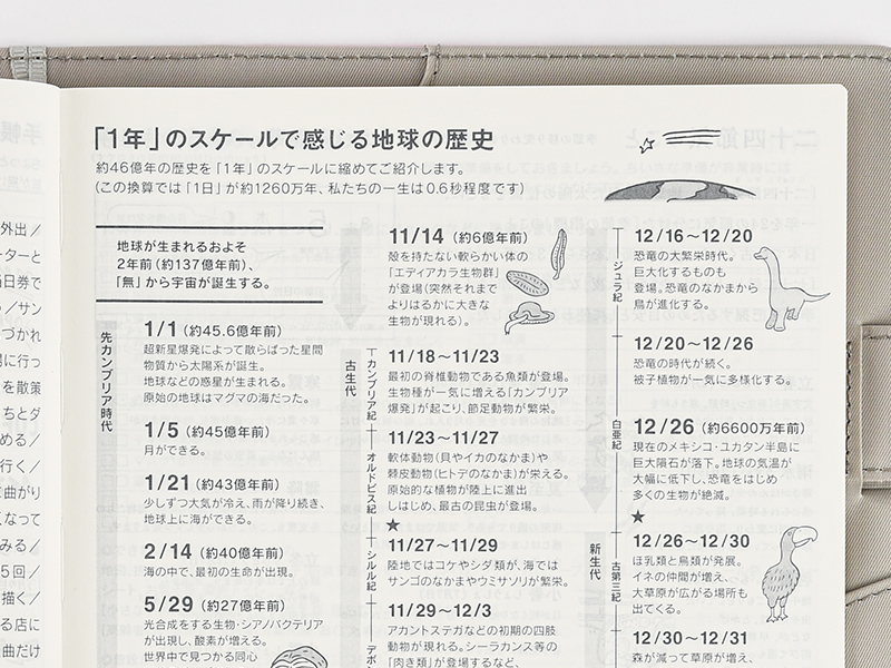 約46億年の歴史を「1年」のスケールに縮めてご紹介します。地球のこれまでに思いを馳せることで、「いま」が、すこし違って見えてきます。