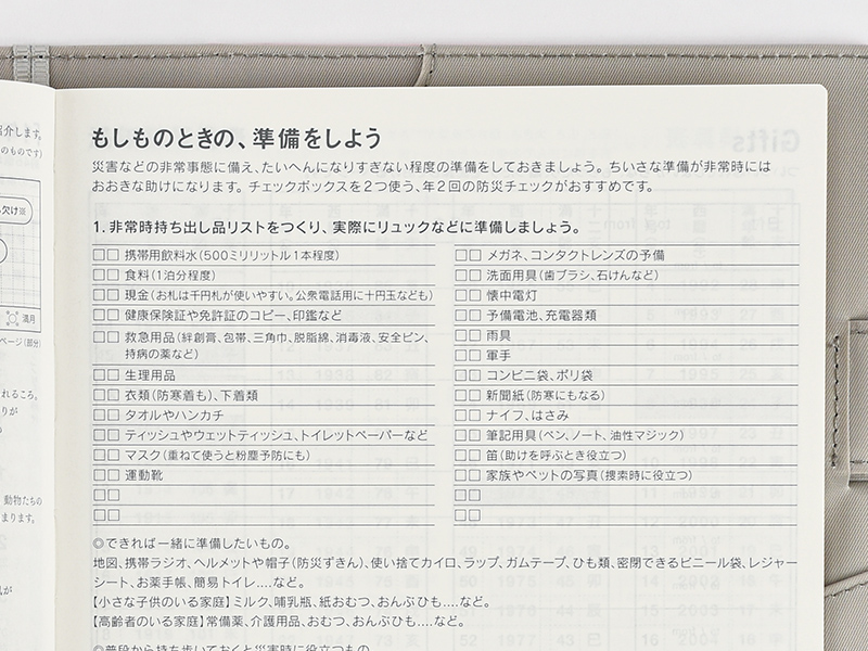 非常時の持ち出し品と、ふだんから備蓄しておきたいものをまとめました。避難場所や緊急連絡先など、家族や親しい人と話し合ったことを書いておけるスペースもあります。