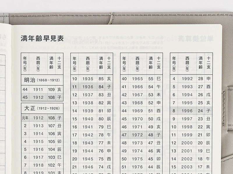 満年齢と十二支が、ひと目でわかる早見表。満年齢0歳から108歳まで掲載しています。2020年の干支である「子」の行は背景に色を入れ、年男と年女がすぐわかるようにしました。