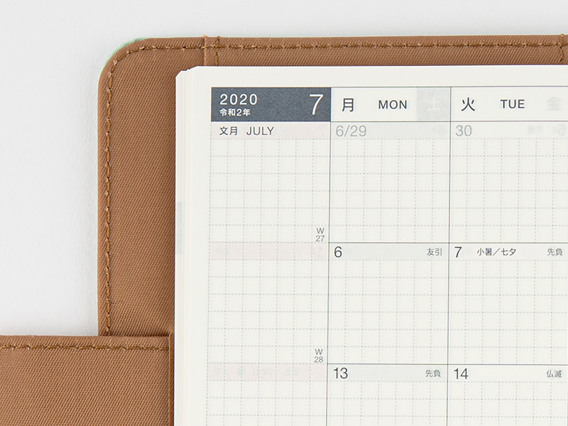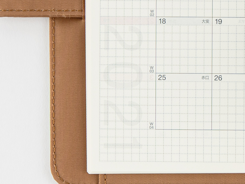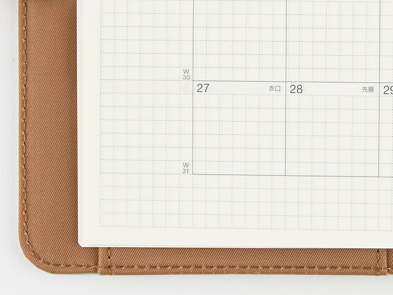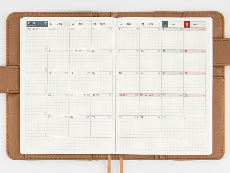 ページ全体に方眼がうすく印刷されていて、予定やメモを記入しやすくなっています。ブルーグレーとレッドの、書きこんだときにも視認性の高いデザインです。<「月間カレンダー」掲載期間>day-free オリジナルサイズ・カズンサイズともに:2019年12月~2021年3月