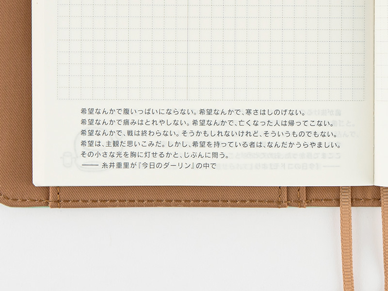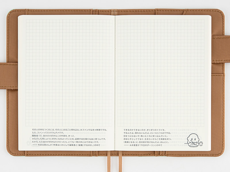 「ほぼ日刊イトイ新聞」のコンテンツから厳選したさまざまな言葉を、1ページにひとつずつ掲載しています。考えの思いがけないヒントになったり、手帳をつけている時間に、ちょっぴりたのしい気分をプラスしたりしてくれます。