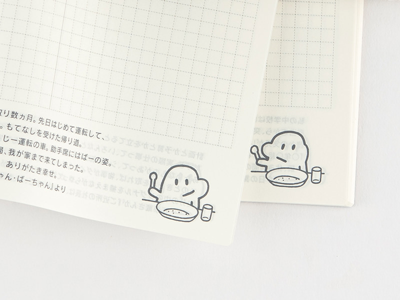 「方眼ノート」の全ページの右下にあるイラストはパラパラマンガ。NHKの「どーもくん」や「こまねこ」を手がけるドワーフのアニメーション作家・ごうだつねおさんに作っていただきました。パラパラめくるときのたのしさはもちろん、絵自体がひとつひとつ魅力的なので、手帳をつけるときにもうれしさがあります。