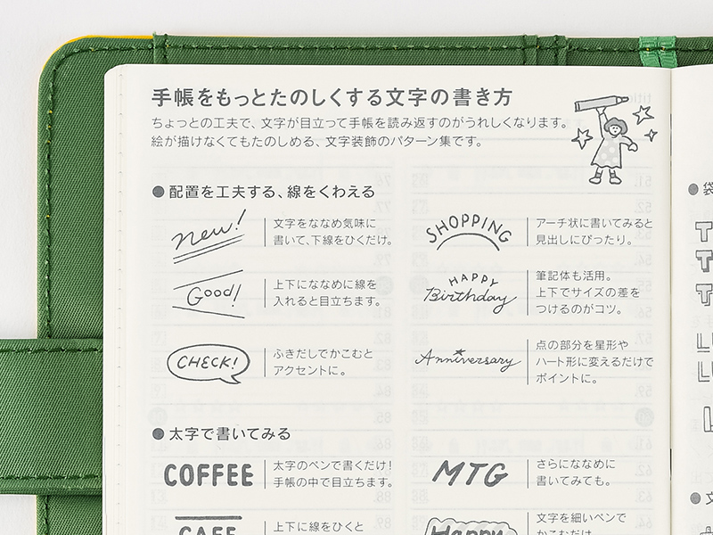 ・巻末のおまけページを新しくしました。<2020年版で追加したもの>「My 100」「手帳をもっとたのしくする文字の書き方」「毎日の視点を変えてみる」「『1年』のスケールで感じる地球の歴史」<2019年版からなくなったもの>「おぼえておきたい、たいせつな言葉」「機嫌よく暮らすためのヒント」「世界の朝ごはん」「時間をかけて読む、古典文学の入口」・年号改正のタイミングが製作時期の後に来てしまったため、年号は記載していません。