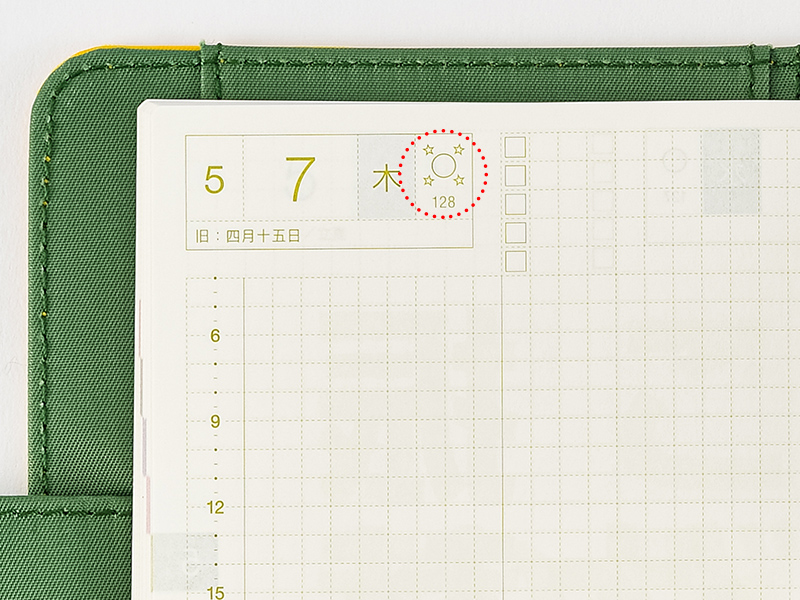 1月1日から数えて何日目であるかを表した「日番号」と、日本でその日に見られる月の形を記載しています。「満月」は「☆」のついた「◯」で、「新月」は「☆」のついた「●」で表しています。