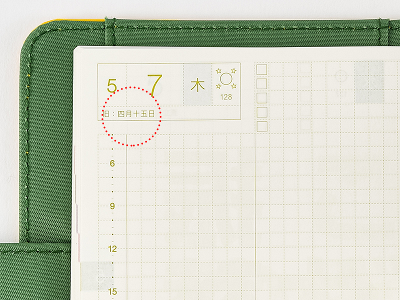実際の日付の下に旧暦を掲載しています。旧暦に基づいた季節を表す区切りの日である「二十四節気」や「雑節」も掲載しています。