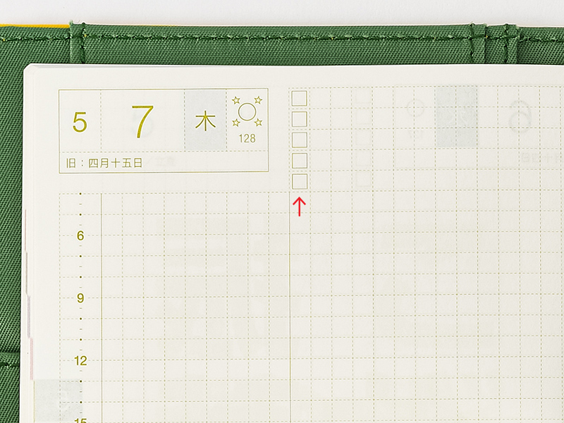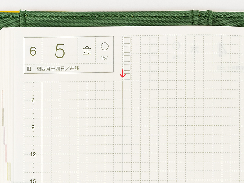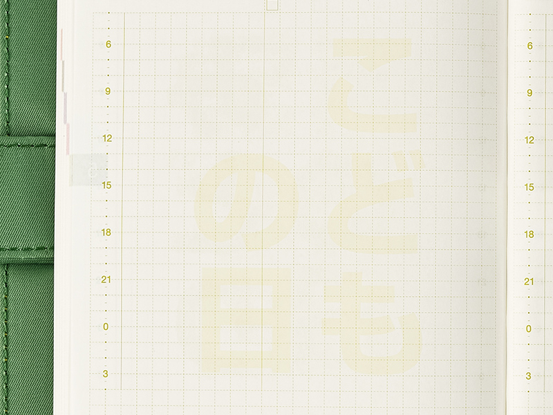 タイムテーブルに予定を書き込むスペースと、メモを書き込むスペースを区切るためのラインをうすく印刷しています。使用しないときにも邪魔にならないちょうどいい線の濃さがポイントです。