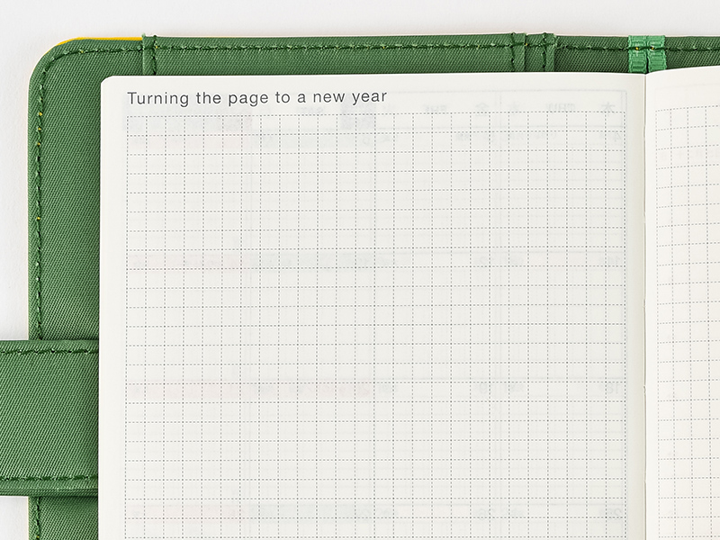 手帳を使いはじめるときのウォーミングアップ用ページです。前の年の出来事を振り返ったり、新年の決意を書いたり、古い手帳から引き継ぐ内容を記したりなど、自由にお使いください。左右の端には、手帳切り替え時期2ヶ月分のカレンダーを掲載しています。
