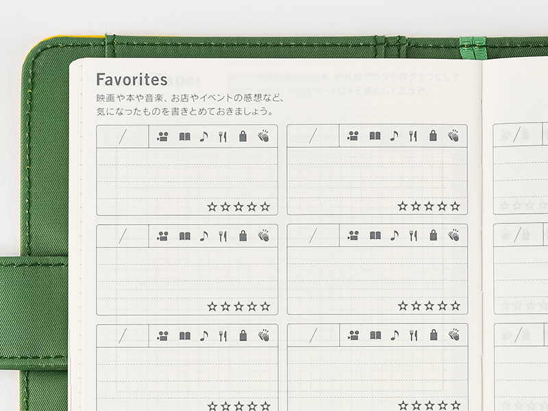 映画、本、音楽、レストラン、買ったものなど、お気に入りを書きとめておくページ。5段階の「☆」マークを使えば、自分だけのランキングもつくれます。