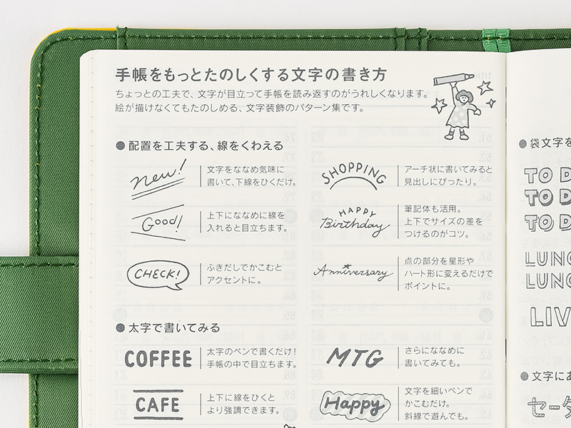 手書きの文字に表情をつけて目立たせる、さまざまな文字装飾のパターンを紹介しています。読み返したときのうれしさが増えます。