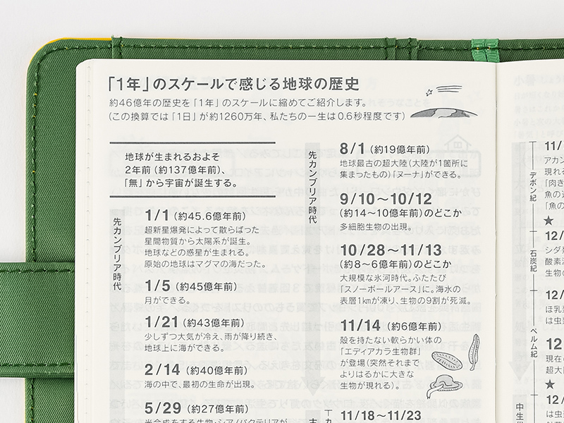 約46億年の歴史を「1年」のスケールに縮めてご紹介します。地球のこれまでに思いを馳せることで、「いま」が、すこし違って見えてきます。
