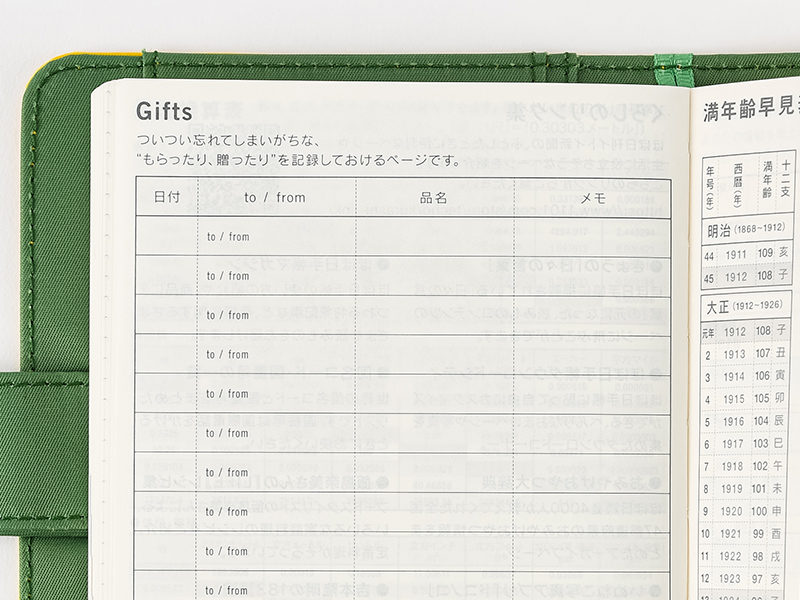 ついつい忘れてしまいがちな”もらったり、贈ったり”を記録しておけるページです。贈り先や贈り主、品名、日付などを17件分書き込むことができます。