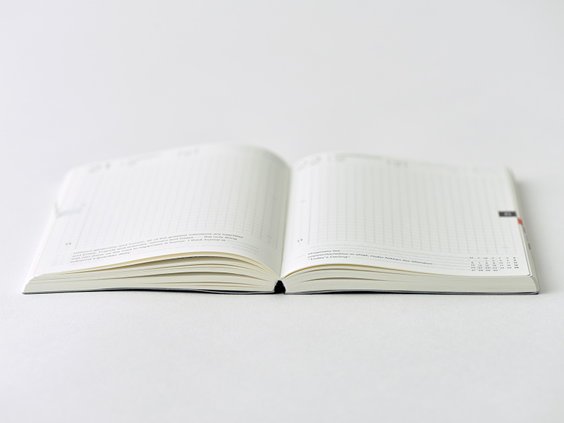 表紙はマットな質感のクロス張りです。漢字の「手帳」の文字と、ARTS&SCIENCEのトレードマークである鍵のマークが箔押しされています。背の部分には「HOBOのロゴ」と「年号」を入れました。