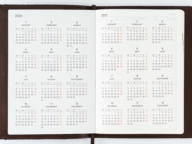 2020年と2021年のカレンダーを見開きで掲載しています。日付は方眼のマス目に1日ずつレイアウトされています。
